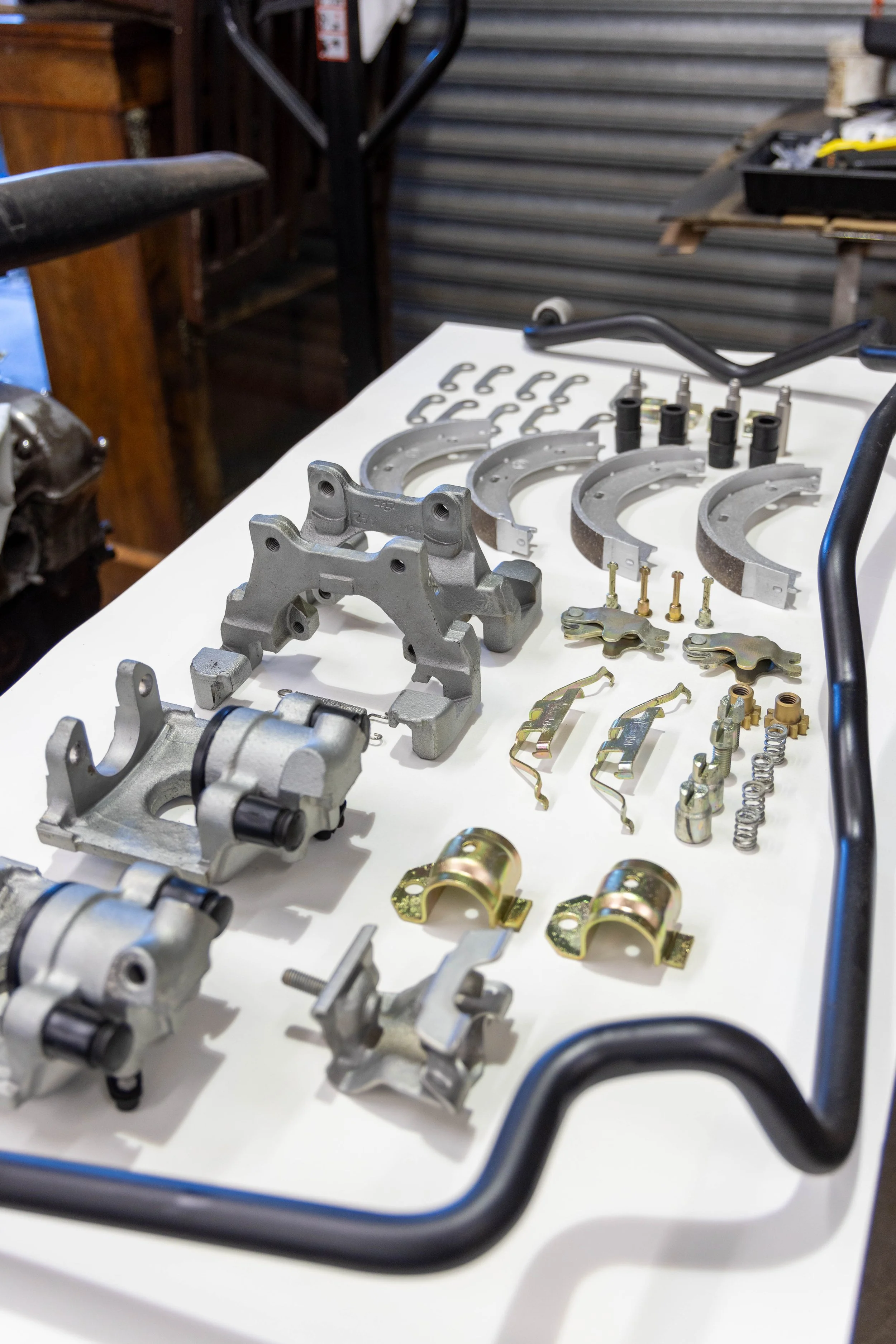 The exhaust heat shields were rotten at the fixing points and were mostly replaced where possible. The front brake discs replaced with a partly worn set as BMW are out of stock, the rears were new. The callipers were blasted and refinished to OE spec with new seals. A new SLS switch was searched for across the world with out success in the end a secondhand unit was sourced where the mountings were re plated along with making a new control rod.